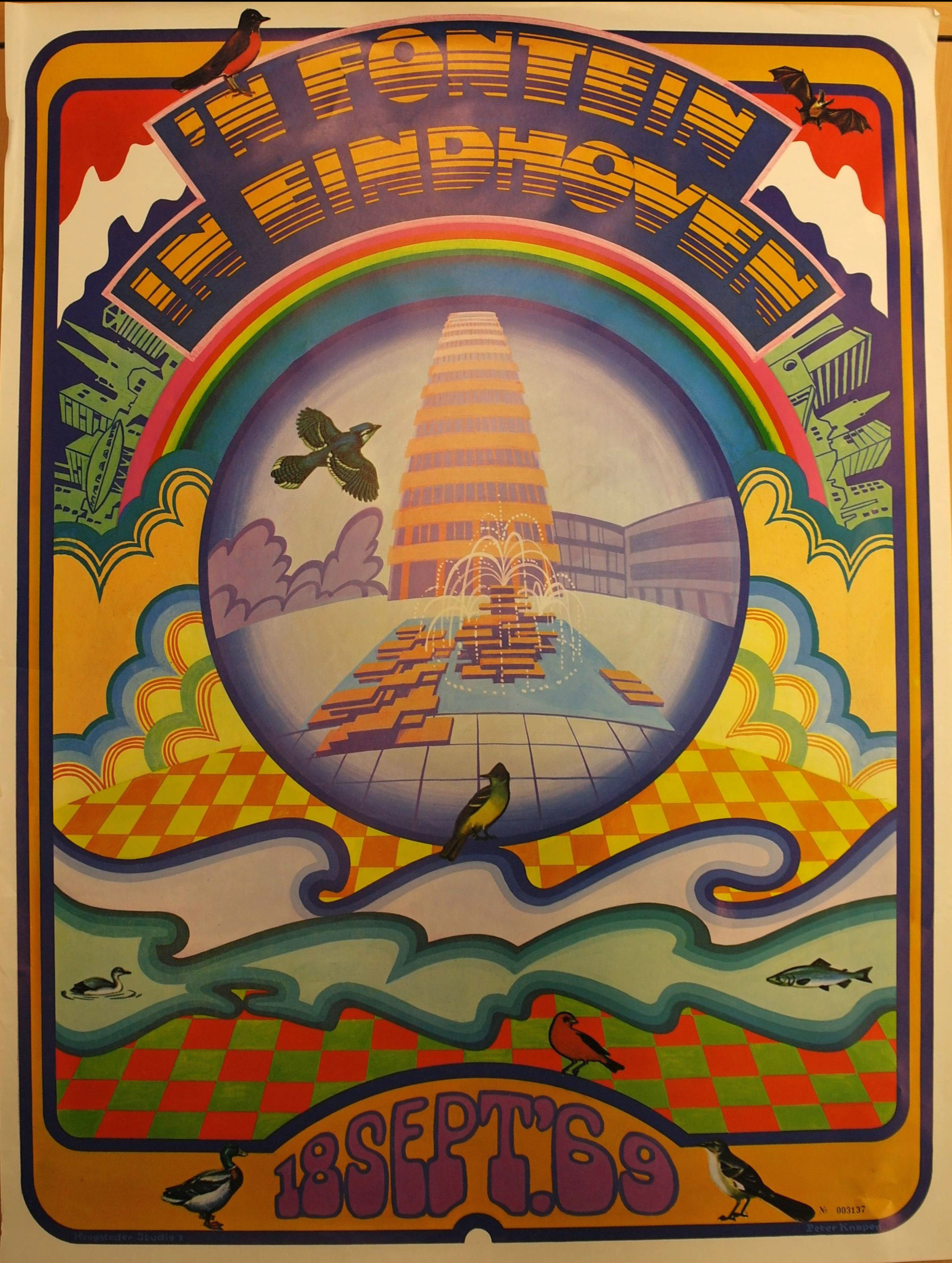 Niet alleen de popcultuur omarmde de kleurige ontwerpen van die tijd. Het hier afgebeelde affiche is een prachtig voorbeeld hoe deze ontwerpen het grafische beeld van die tijd bepaalden. Het affiche is gemaakt naar aanleiding van de feestelijkheden op 18 september 1969. Niet alleen was het precies 25 jaar gelden dat Eindhoven werd bevrijd, ook werd die dag het nieuwe stadhuis geopend. Hare Majesteit de Koningin Juliana was die dag eregast. In het Nederlands, Frans en Engels sprak een ontroerde burgemeester Witte de menigte op het Stadhuisplein toe. Meteen daarop ontstak Koningin Julina met de uit Bayeux opgehaalde fakkel het bevrijdingvuur bij het monument. Om vijf uur die dag verklaarde zij het stadhuis voor geopend, waarna het carillon zich liet horen en het water in de fontein klaterde.