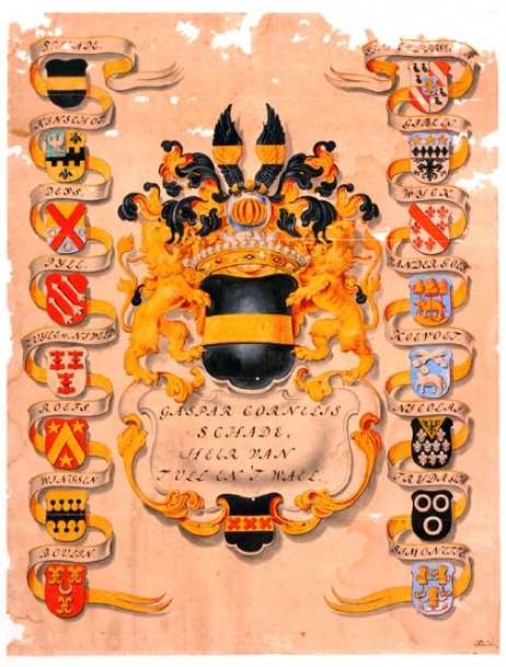 Wapen met zestien kwartieren van Gaspar Cornelis Schade, heer van Tull en ’t Wael uit het einde van de 17e eeuw, getekend door J. Ceulen.