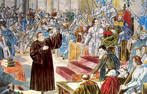 Luther verdedigt voor keizer Karel V op de Rijksdag te Worms, 18 april 1521, zijn stellingen tegen de kerk en de paus. “Hier sta ik, ik kan niet anders” zegt hij bij deze gelegenheid tegen de keizer