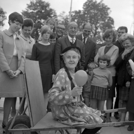 Met een ondeugende blik kijkt een dame al zittend op een kruiwagen naar de camera van fotograaf Frans van Mierlo. Met haar rechterhand houdt ze een ballon vast die bevestigd is aan een rubberen slang waarop mevrouw zit. Haar vrolijke polkadot jurk, haar hoed met lange donkere nepvlechten en de lachende omstanders - en niet te vergeten het ongebruikelijke zitmeubel! - doen vermoeden dat we getuige zijn van een ludiek moment. Op het negatiefzakje schreef Van Mierlo ‘75-jarig bestaan Philips’. Dat was in 1966 en met deze informatie moet u het doen.