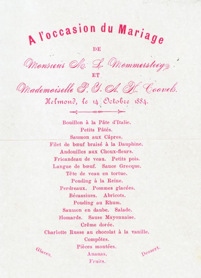 Op ieder feest is het eten en drinken zeer belangrijk. Een gegoede familie als Coovels bood haar gasten een uitgebreide maaltijd aan. Die ziet U op de eerste afbeelding. De tweede foto laat het huis zien waar de bruid tot haar huwelijk woonde. Het is het derde pand van links, het grote huis waar men via een trap naar de voordeur klom.