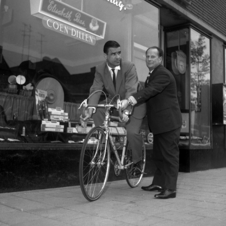 483 wedstrijden heeft ie achter de kiezen, maar niet met deze gelikte tweewieler. We zien hier namelijk niemand minder dan Het Kanon - Coen Dillen - poserend voor zijn tabakszaak aan de Frederiklaan. De persoon Coen behoeft geen nadere toelichting, maar we willen o zo graag weten waarom deze foto genomen is. Zijn nette pak ontneemt ons het zicht op zijn kuiten. Was het misschien een hartenwens van Coen om ook nog de boeken in te gaan als wielerkanon?