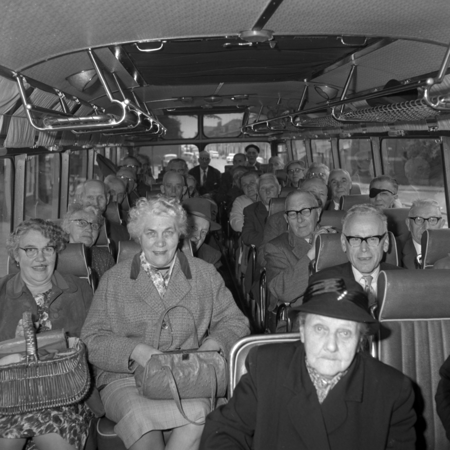 Gisterenavond hebben de dames met militaire precisie hun uitstapje van vandaag voorbereid. De dame rechtsvoor heeft de hoed eerst boven een pan kokend water gestoomd en daarna opgeborsteld. De hoedenspeld glimt nu ook weer en zit goed vastgestoken. De dames zijn op alle mogelijke calamiteiten voorbereid. In hun bagage zit daarom een nieuw rolletje King pepermunt, een schone zakdoek, een plastic regenkapje en een reservepanty. Indien van katholieke signatuur zit er in de portemonnee de reisverzekering bestaande uit een prentje van Onze Lieve Vrouw van Altijddurende Bijstand en een medaille van St. Christoffel, om gevaren onderweg op afstand te houden. De heren daarentegen hebben ’s ochtends het frisgewassen en gesteven overhemd aangedaan wat moeder de vrouw had klaargelegd. Schone zakdoek in de broekzak, stropdas om en klaar. Maar welk avontuur lonkt hier? Waar gaat dit gezelschap naar toe en wat was de aanleiding?