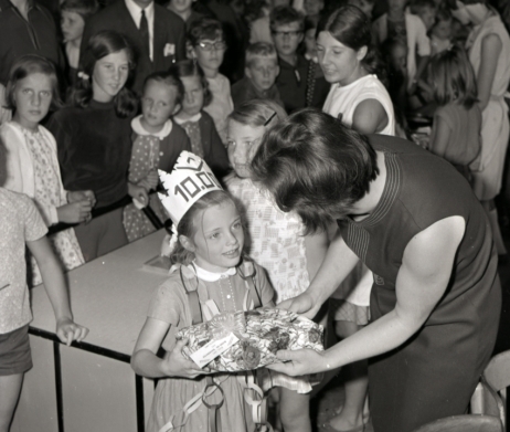 We spreken hier over de jaren ’60, het tijdsgewricht dat slechts ruimte laat voor twee momenten in het jaar waarin je kans maakt op cadeautjes, namelijk met je verjaardag en op pakjesavond. Deze jongedame had echter het geluk om als tienduizendste de ingang van Wonderland, het legendarische festijn voor de Eindhovense schooljeugd tijdens de grote vakantie, te betreden. Maar wie is deze bofkont? En wat zat er nou in het pakje? Weet jij het? Reageer dan a.u.b. op dit bericht.