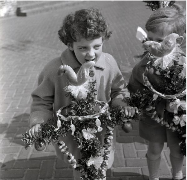 Toen fotograaf Frans van Mierlo dit meisje en haar palmpasentak tijdens de palmpasenoptocht in 1958 fotografeerde, was de vastentijd met inbegrip van Palmpasen nog een zeer serieuze aangelegenheid, ook voor kinderen. Vasten, biechten, bidden en kerkbezoek. De Palmpasenoptocht waarmee de intocht van de op een ezel zittende Jezus in Jeruzalem wordt herdacht, moet voor vele kinderen een heuse kwelling oftewel oefening van wilskracht en godvrezendheid zijn geweest, er moest immers nog steeds gevast worden! De lekkernijen die de palmpasentak sieren, het broodhaantje, de eieren, rozijnen en snoepgoed als zuurtjes, karamels en toffees bungelden tijdens de processie op hapafstand verleidelijk voor de mond. Pak me dan als je kan, als je durft …..