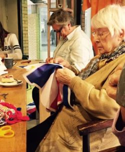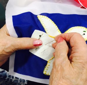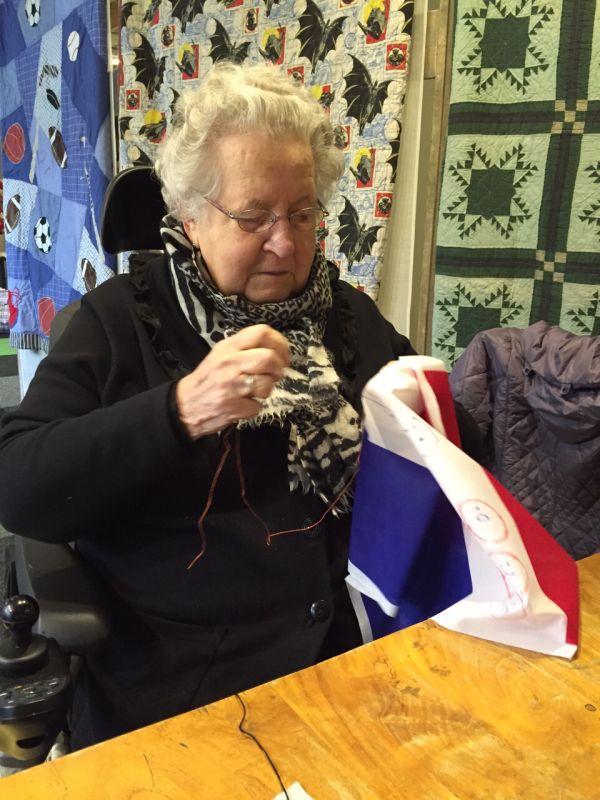 De vrijheidsquilt van 4 x 3 meter. Een aantal bewoonsters van de Archipel hebben hier aan meegewerkt. Enkele maaksters vertellen hun oorlogsherinneringen.