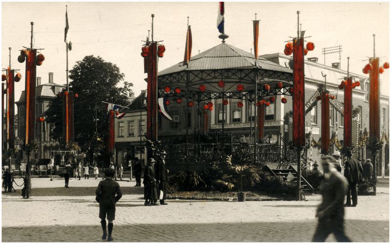 De winkel van Ebben blijft dan ook bestaan. Vanaf 1916 werken de firmanten nader samen in de nieuwe Combinatie EDAH. En die mondt in 1917 weer uit in de N.V. EDAH. Dan exploiteert de firma zelf ook winkels, maar Ebben blijft een eigen winkel houden. Dat maakt dat er jaren lang naast elkaar op de Markt de winkels van EDAH en Ebben liggen. Op de eerste foto is het pand van Ebben te zien. Het is een diep pand, waarvan de zijgevel een flink deel van de Ameidestraat beslaat. De foto is gemaakt tijdens de feesten ter gelegenheid van het 25-jarig regeringsjubileum van koningin Wilhelmina. De kiosk is prachtig versierd, vlaggen wapperen en bij de ingang van de Ameidestraat staat een ereboog met de tekst: Leve de koningin. Links staan allemaal stoelen opgesteld. Vermoedelijk is de foto gemaakt net voor het feest op de Markt zal losbarsten. Een paar kinderen wachten daar niet op. Ze zwaaien aan een rekstok.