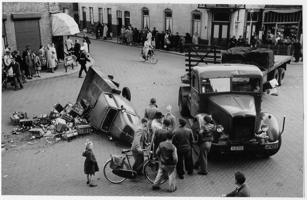 Hoewel er geen verslag van het ongeluk te vinden is -het is enkel bekend dat het in 1952 is geweest- valt aan dat wat op straat ligt af te leiden dat het een wagen van een drankhandel is geweest. Te onderscheiden zijn kratten Amstel bier en houten kisten met Hero-Perl limonade. Als we ons niet niet vergissen zijn er ook openstaande kartonnen wijndozen te zien. Net voor de achterwielen van de grote vrachtwagen ligt ook nog een krat. Het ongeluk is gebeurd op de hoek van de Heistraat en het Binderseind. Op nummer 30, rechts van de Heistraat, zat brood- en banketbakker Toon Nieuwenhuis. Links van de Heistraat is het pand van slager Verschuuren te zien. Dit laatste pand is inmiddels gesloopt. Aan het verkeersbord valt af te lezen dat de Heistraat vijftig jaar geleden nog de doorgaande straat was richting Bakel en Boxmeer.