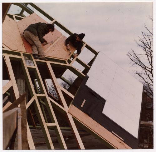 De foto laat zien hoe bouwvakkers manoeuvreren tegen schuine wanden om dakplaten aan te brengen. Deze schuine wanden behoren de paalwoningen aan de Wilhelminalaan toe. Ze werden in 1974 gebouwd als proefwoningen voor het te realiseren ontmoetingscentrum en woningenwoud op de lege plek die het zusterklooster had achtergelaten.