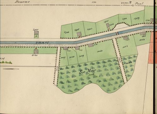 En het Soemeer? Dat bruiste en schuimde continu, zoals het bruiste en schuimde toen de gloeiige zich erin stortte en het vuur van zijn hellewagen en kettingen in het Peelwater sissend doofde. Het Soemeer bruiste en schuimde tot het een prooi werd van de ontginners. Niet alleen de naam ‘Soemeersingel’ in Helenaveen herinnert aan haar aanwezigheid. Met het naburige Broemeer dwong het Soemeer vervener Van de Griendt in 1853 tot een knik in de Helenavaart. Het Peelkanaal kon niet in rechte lijn door het meer gegraven worden, want het was - zoals het verhaal van de pastoor en de gloeiige ook al aangeeft – bodemloos, peilloos. Het kaartje geeft de ligging van het Soemeer en de kanaalknik duidelijk weer. Het is een fragment van een grote kleurenkaart die de Maatschappij Helenaveen in 1889 van haar eigendommen in de Peel liet maken. Het Broemeer lag tegenover het Soemeer, aan de andere kant van de vaart.